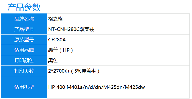 • 商品名稱:格之格 CF280A 硒鼓NT-CNH280C 雙支裝 適用于惠普HP400 M401A M401D M401DN M425DN M425DW 280A(kj)