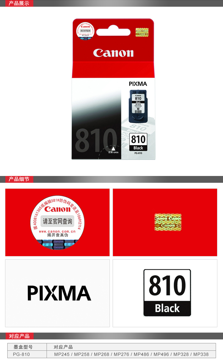 • 商品名稱:佳能 (Canon)PG-810 黑色墨盒 適用MP245 MP258 MP268 MP276 MX328 MX338 MP468 MP496