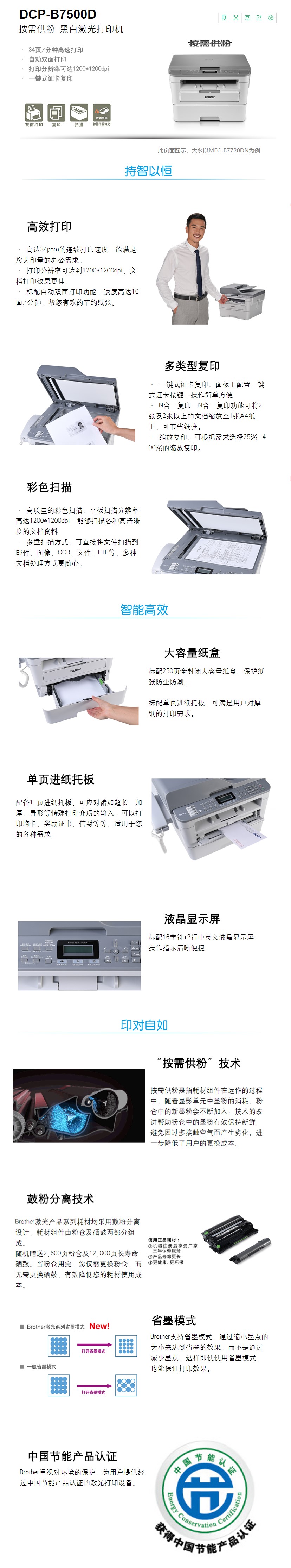 - 商品名稱:兄弟(brother)DCP-B7500D A4黑白激光多功能一體機1200*1200 dpi 打印/復(fù)印/掃描 34頁/分鐘 自動雙面打印 適用耗材:DR-B020/TN-B020 鼓粉分離 一年保修