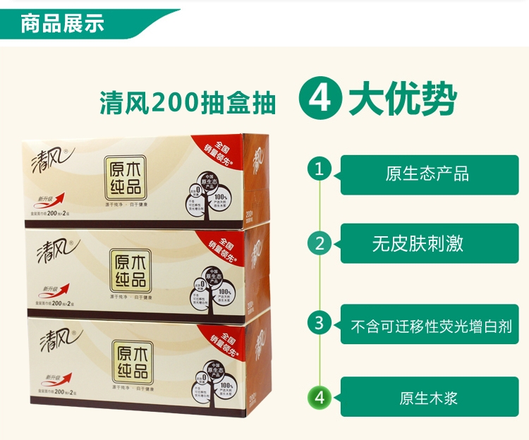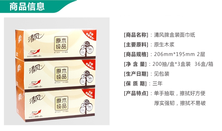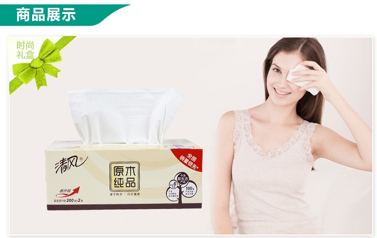 • 商品名稱(chēng):清風(fēng) 原木純品盒裝抽紙 B338CN 白色 2層 206*195mm 200抽/盒 36盒/箱 單盒價(jià)格 1箱起送(kj)