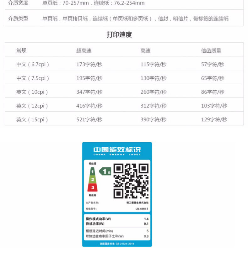 • 打印速度:高速一檔模式下168漢字/秒(7.5cpi)