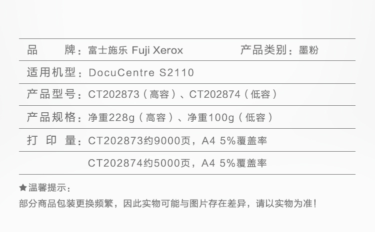 • 商品名稱:富士施樂(lè)(Fuji Xerox)碳粉(大容)CT202873適用于SC 2110