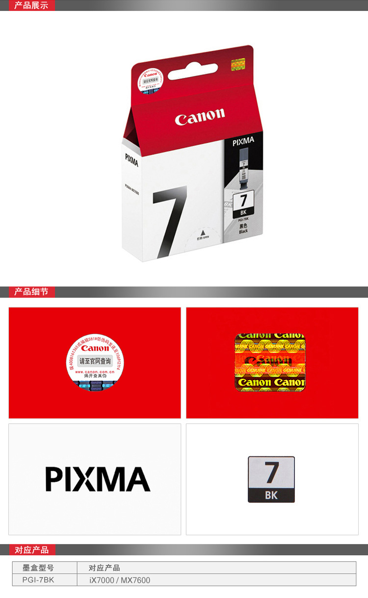 • 商品名稱:佳能(Canon)PGI-7BK 黑色墨盒 適用于iX7000、MX7600