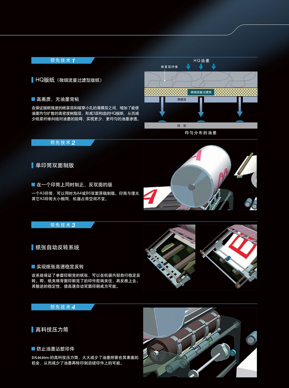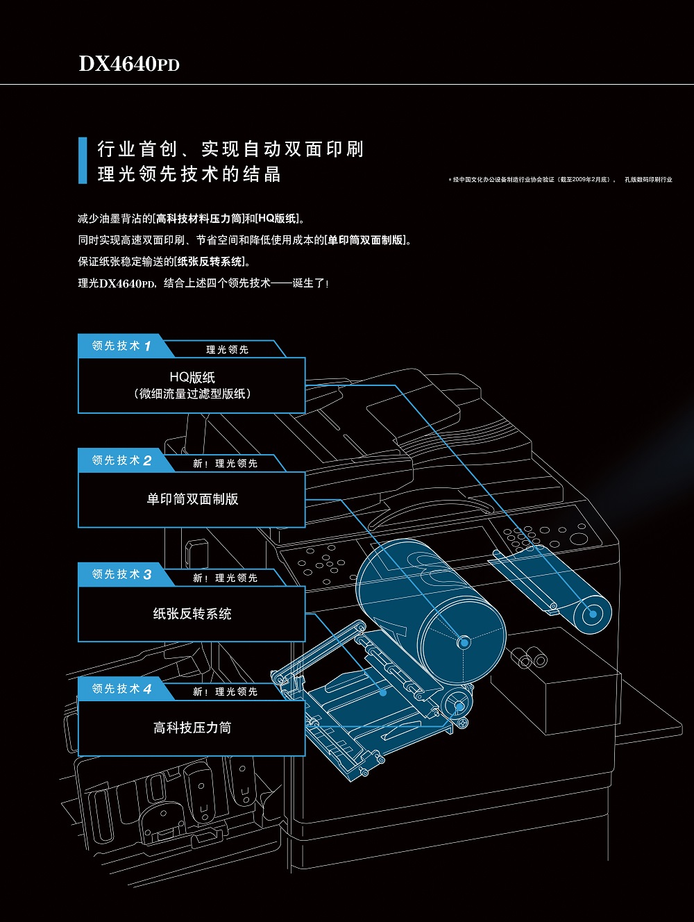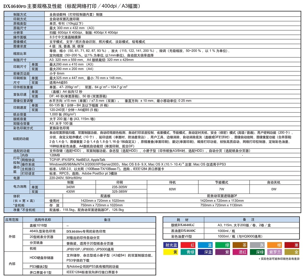 • 適用耗材:版紙DX4640LC(115m/卷),黑墨盒DX4640C,TypeVII型彩色油墨