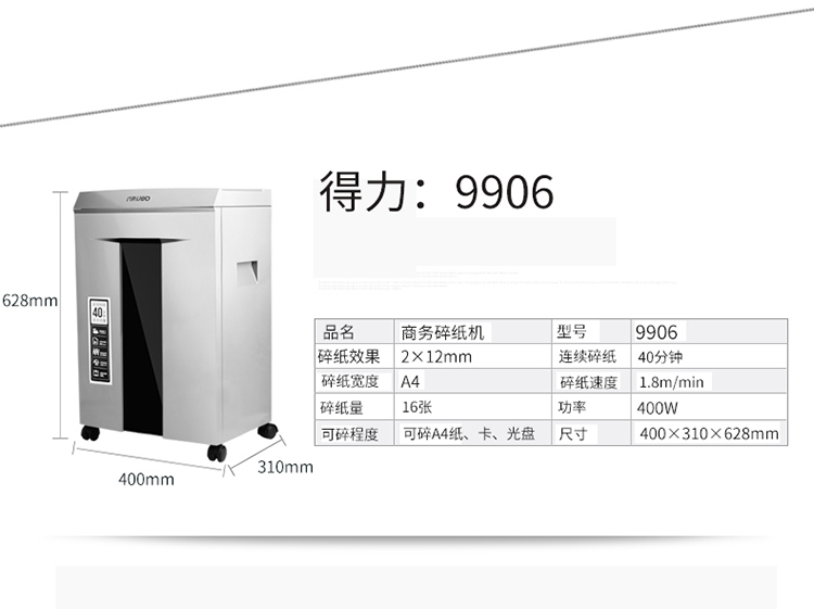 • 商品名稱:得力(deli) 9906 大容量辦公碎紙機 保密碎紙機 續(xù)航40分鐘 400x310x628mm