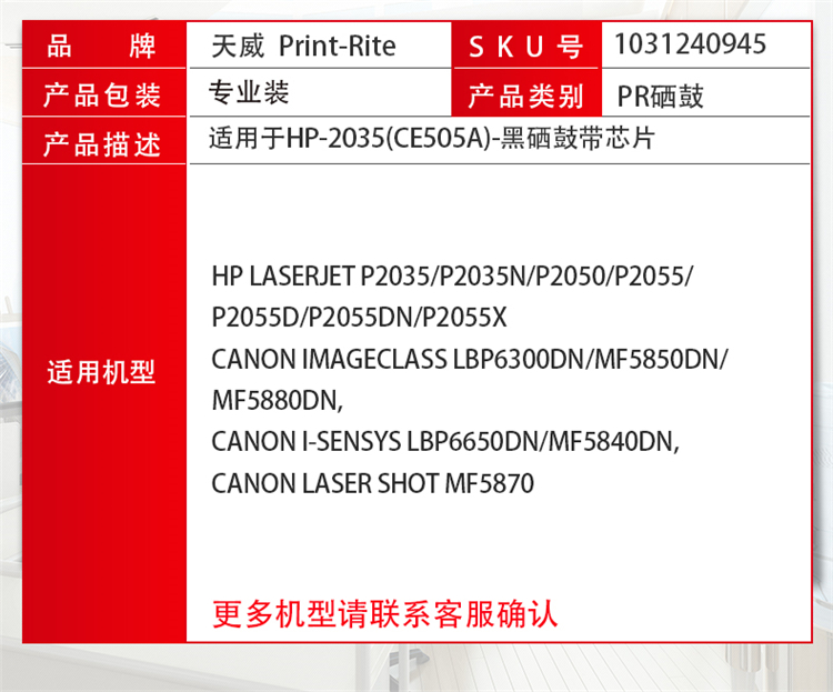 • 商品名稱:天威(PRINT-RITE) CE505A 黑色硒鼓 帶芯片適用HP-2035 2035N P2050 P2055 黑色(kj)
