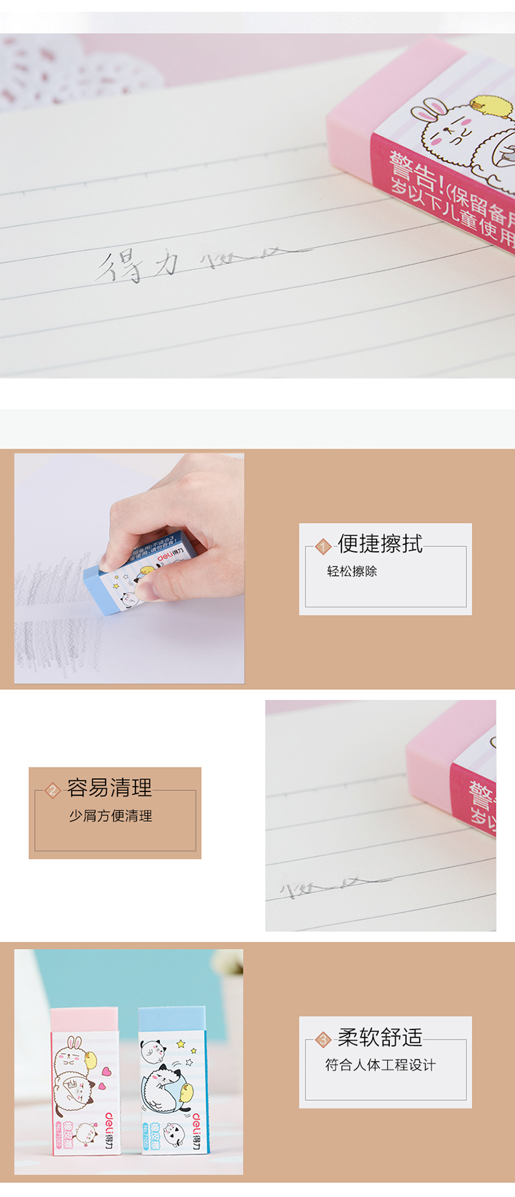 得力(deli) 71062 學生彩色橡皮擦 30塊/盒 60*27*11mm/塊 1塊裝 30塊/盒(kj)