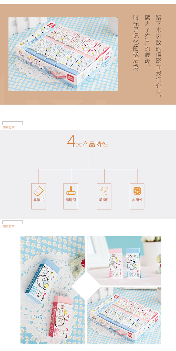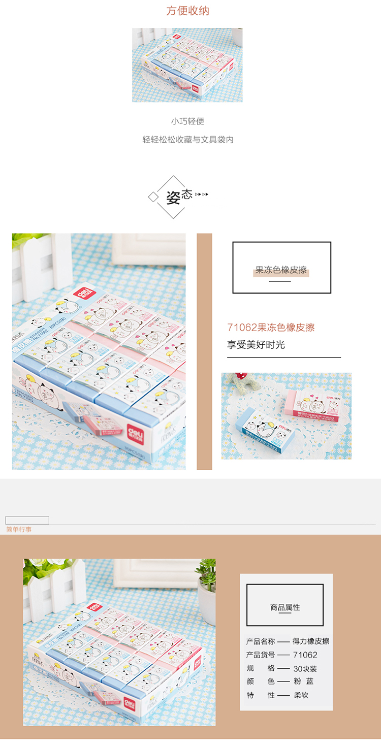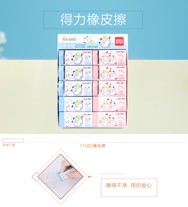 • 商品名稱:得力(deli) 71062 學生彩色橡皮擦 30塊/盒 60*27*11mm/塊 1塊裝 30塊/盒(kj)