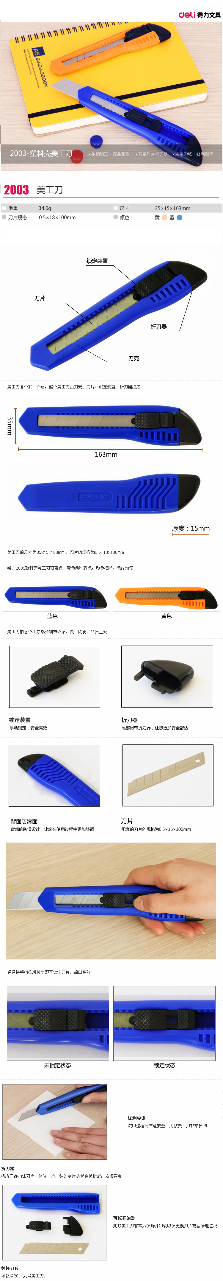 • 商品名稱:得力(deli) 2003 大號通用辦公家具美工刀/裁紙刀 顏色隨機 (kj)
