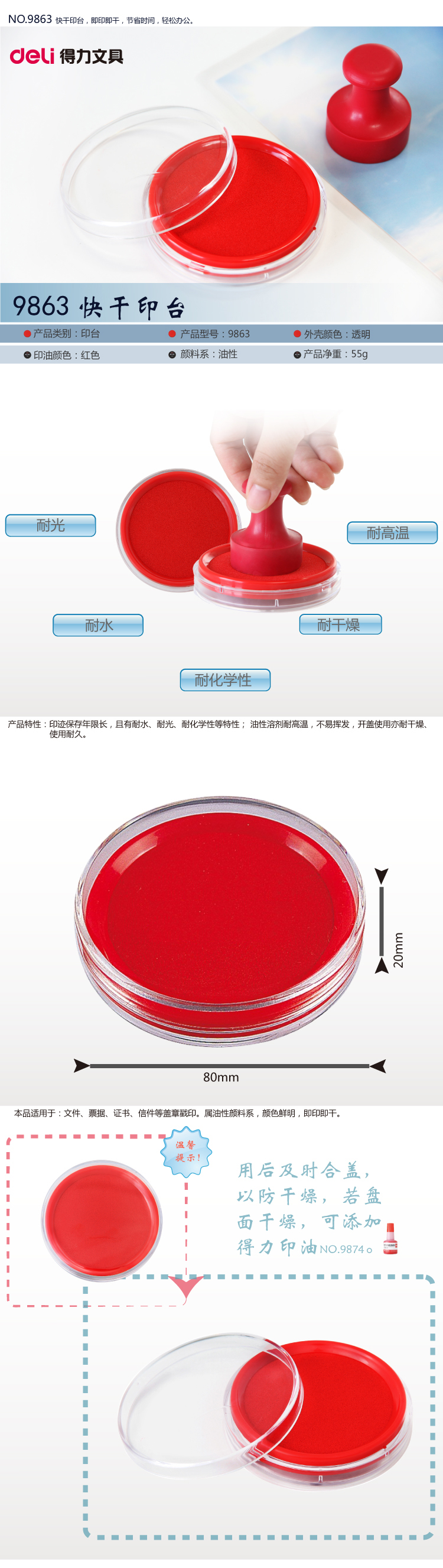 • 型號:得力(deli) 9863 快干印臺 80*20mm 圓型 油性 紅色