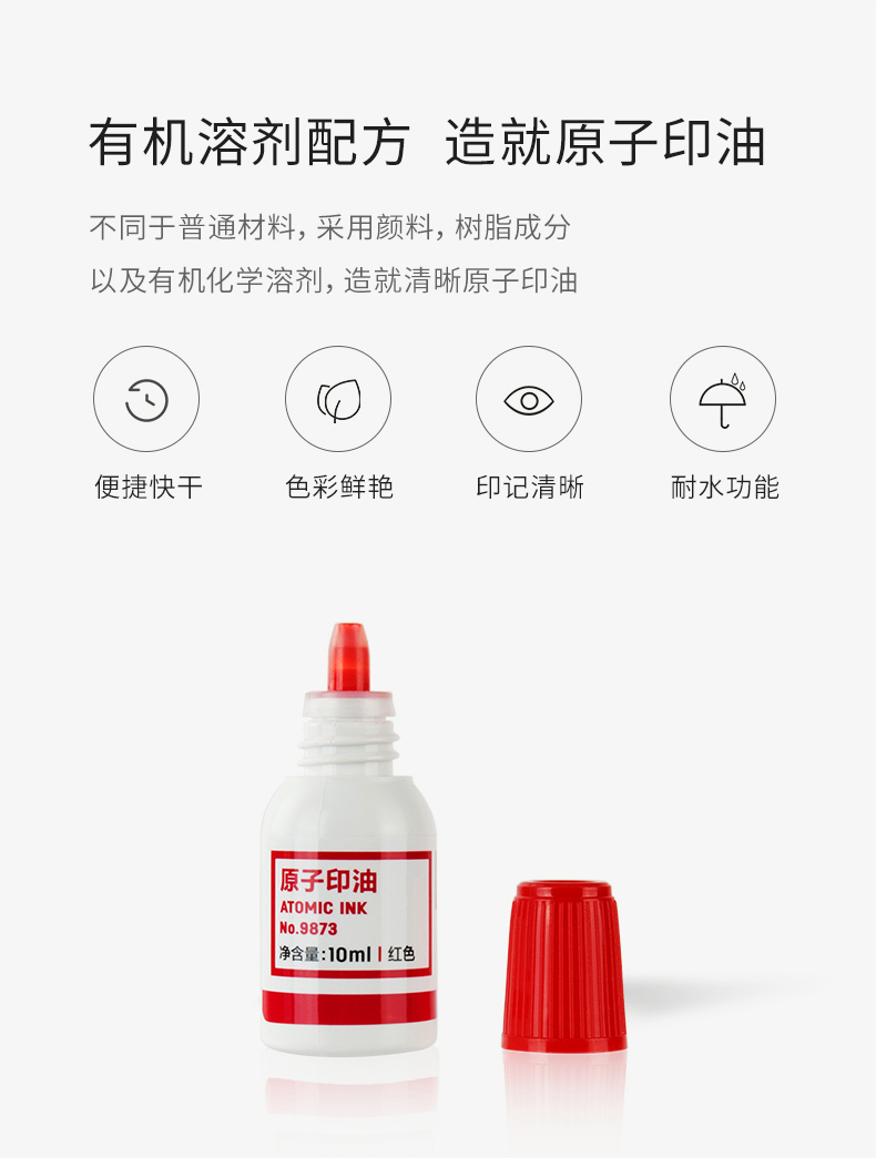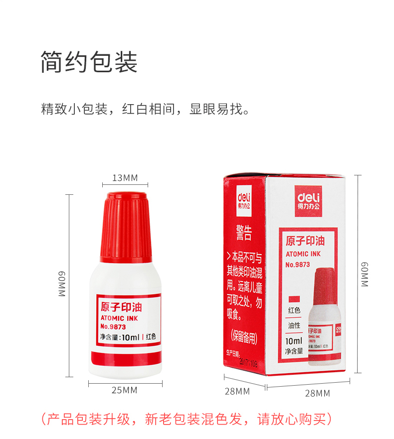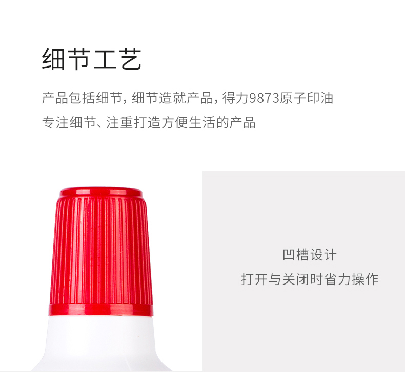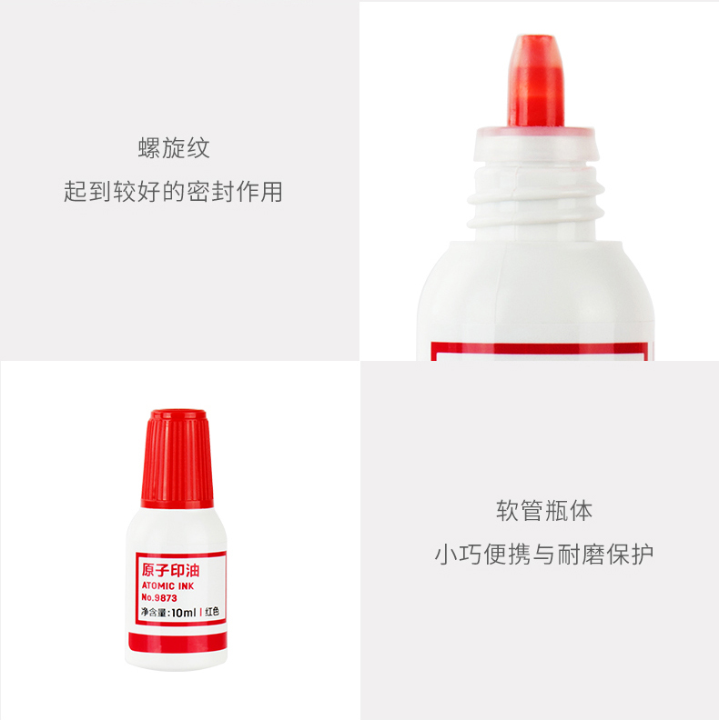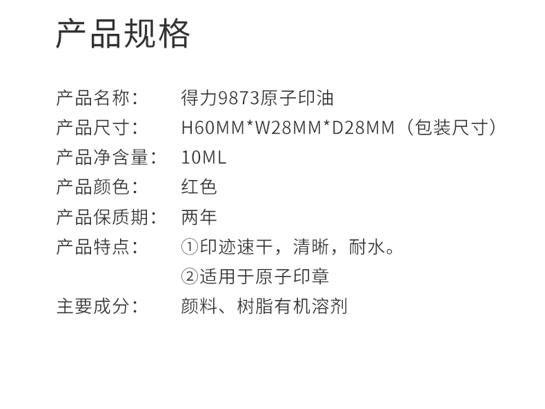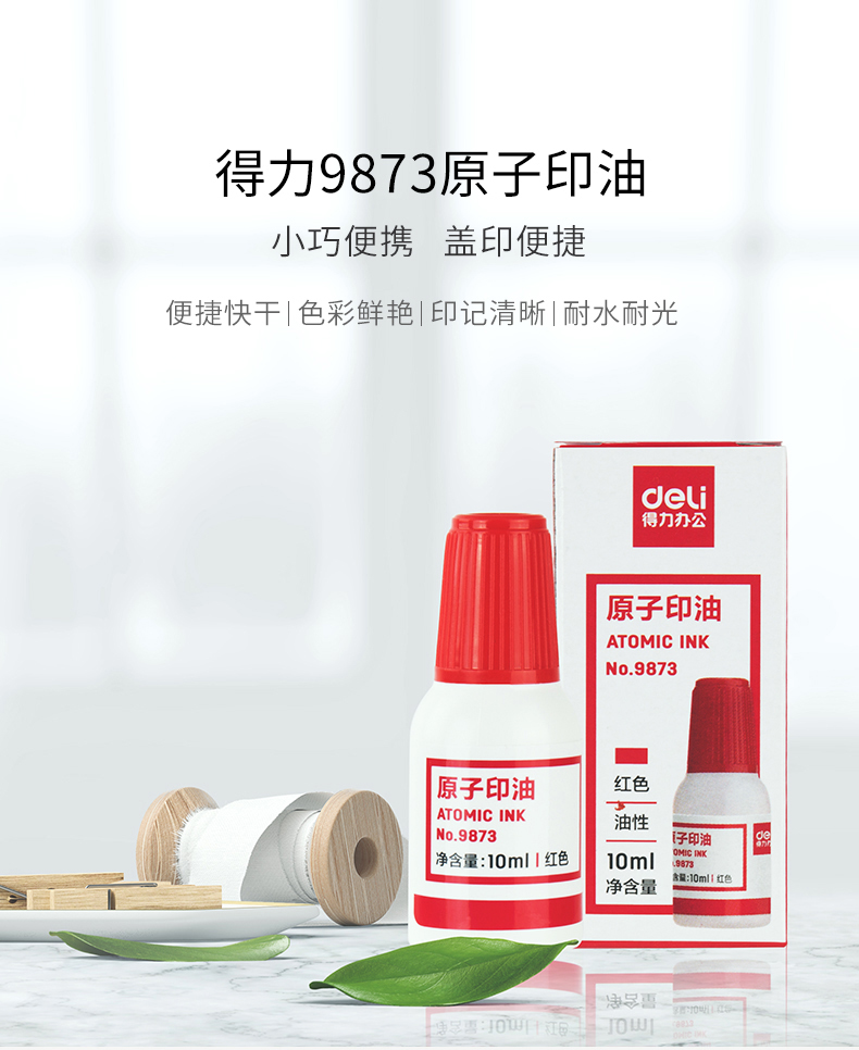 • 商品名稱:得力(deli) 9873 10ml原子印油 印臺(tái)印泥油印章油專用快干 藍(lán)色/紅色(單個(gè)裝)
