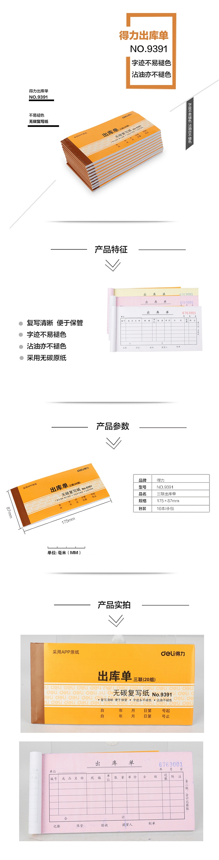 • 商品名稱:得力 9391 三聯(lián)出庫(kù)單據(jù) 175x87mm (單位:本) 黃