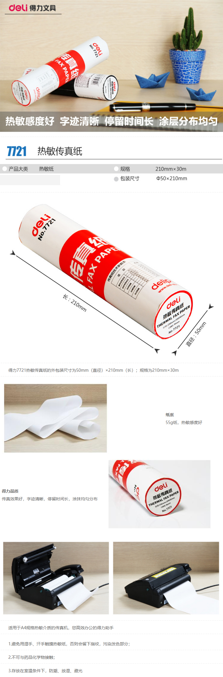 • 型號(hào):得力熱敏傳真紙7721