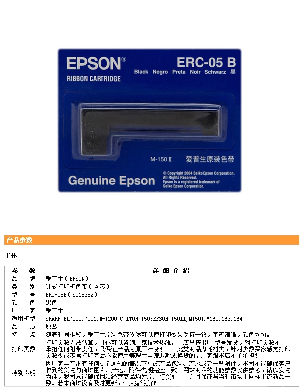 • 商品名稱:愛普生ERC-05色帶框 適用于EL7000,7001,H-1200;EPSON 150Ⅱ,M1501,M160,163,164 (kj)