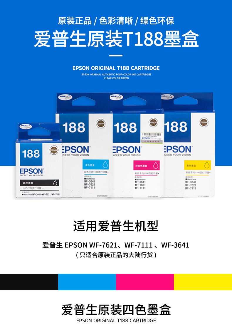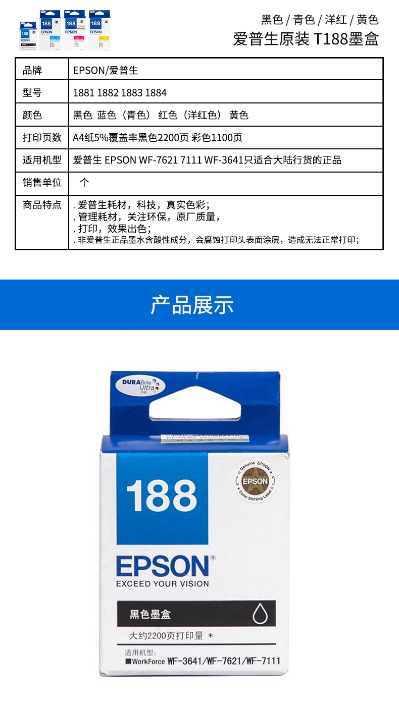 • 商品名稱:愛(ài)普生(EPSON) T188 墨盒 適用WF3641/7111/7621/7218/7728 T1884 黃色墨盒 (kj)