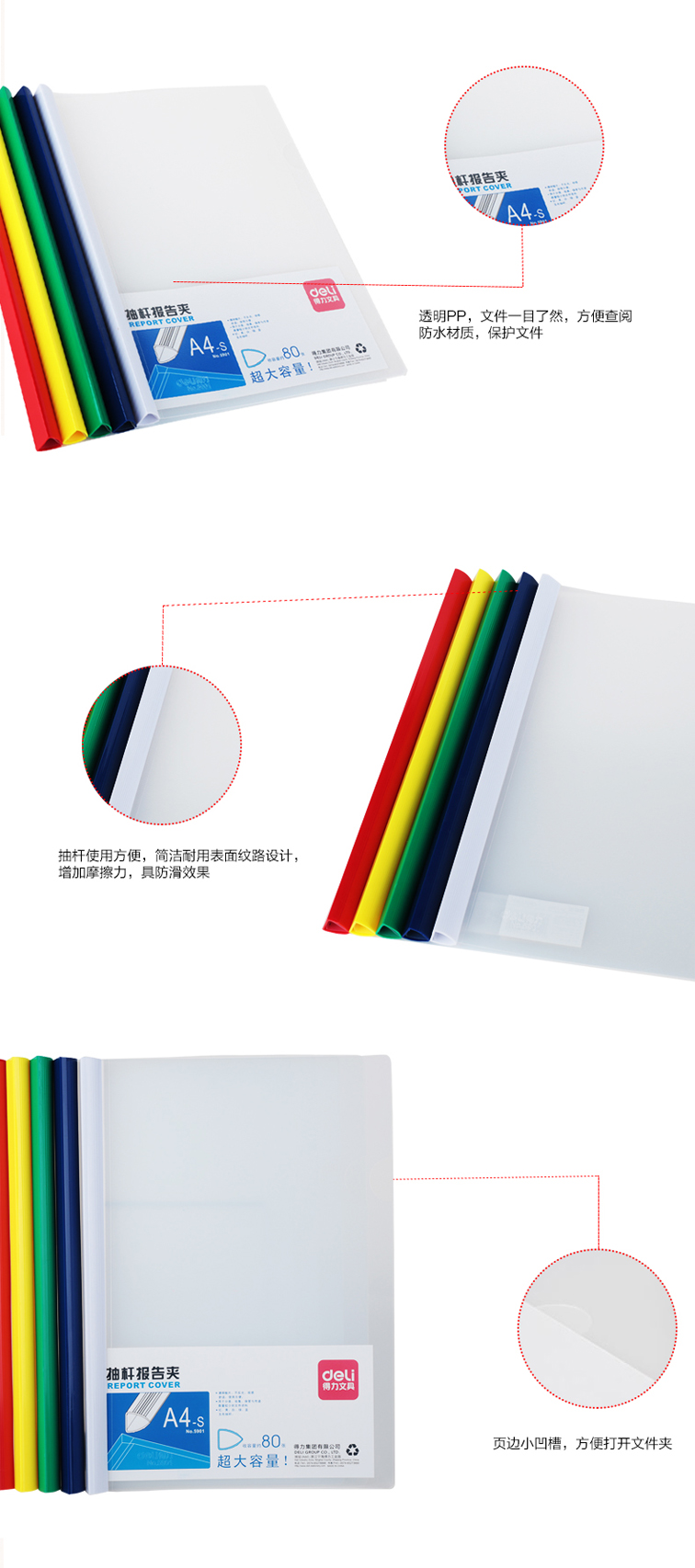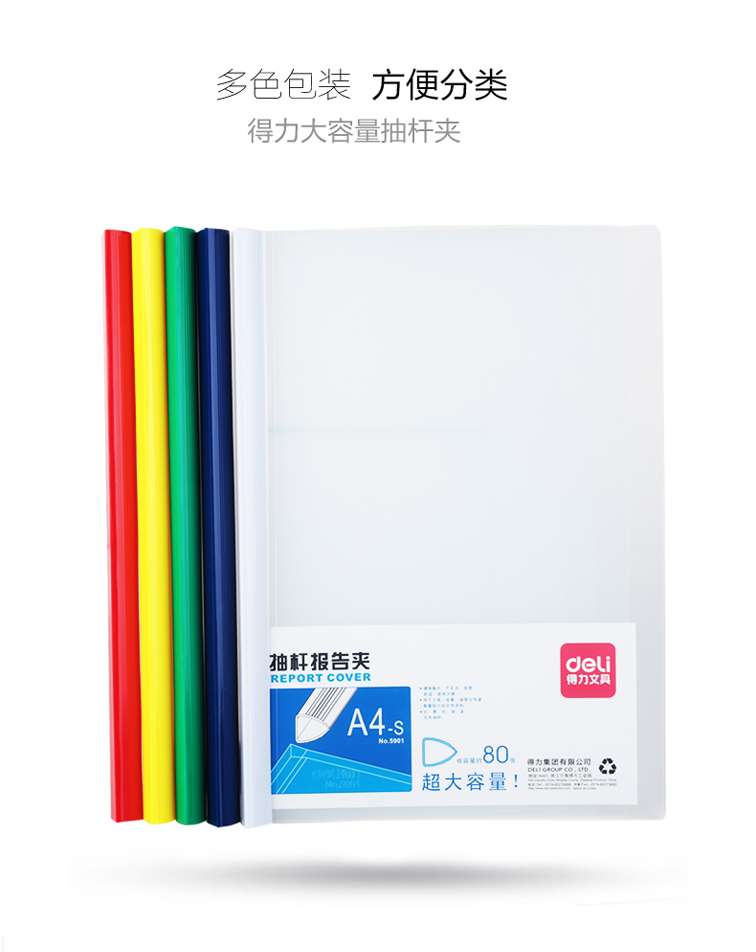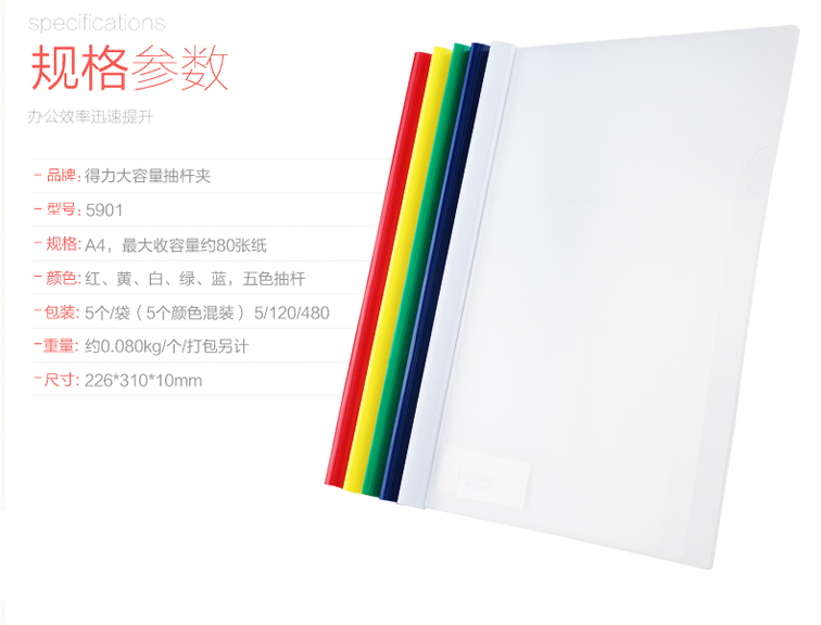 • 型號(hào):得力大容量抽桿夾 5901 A4 80張 混色