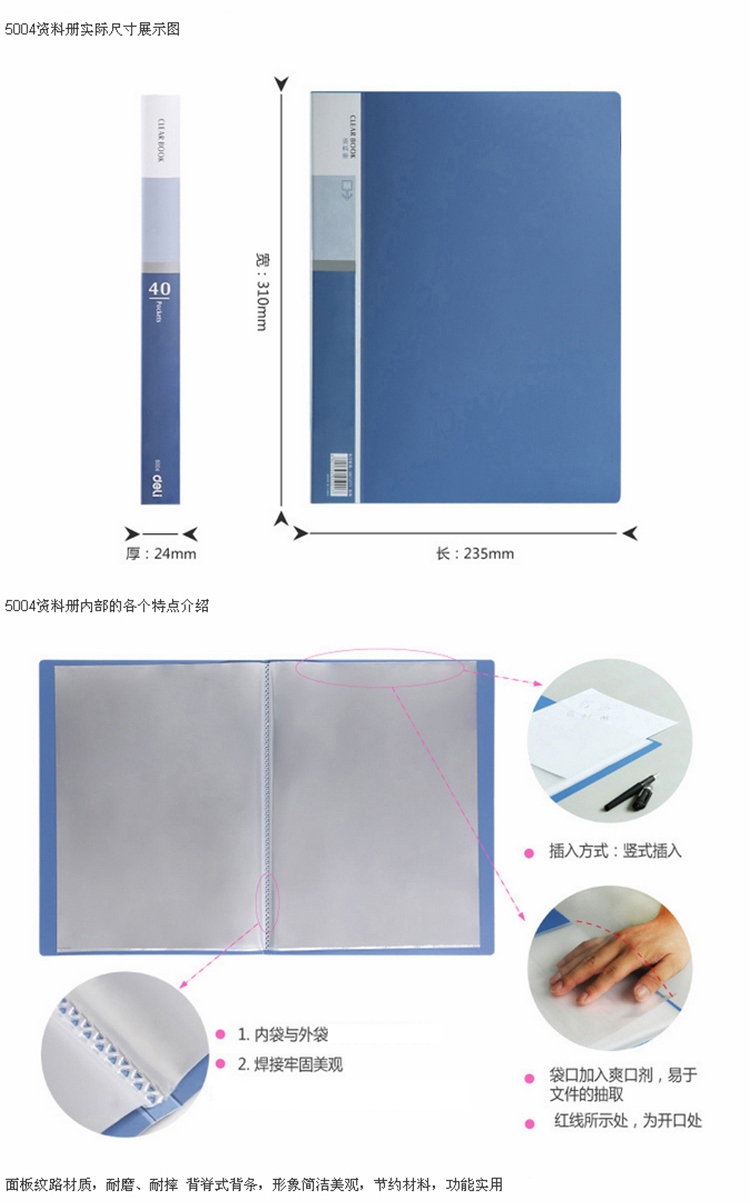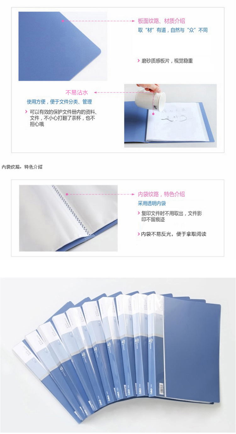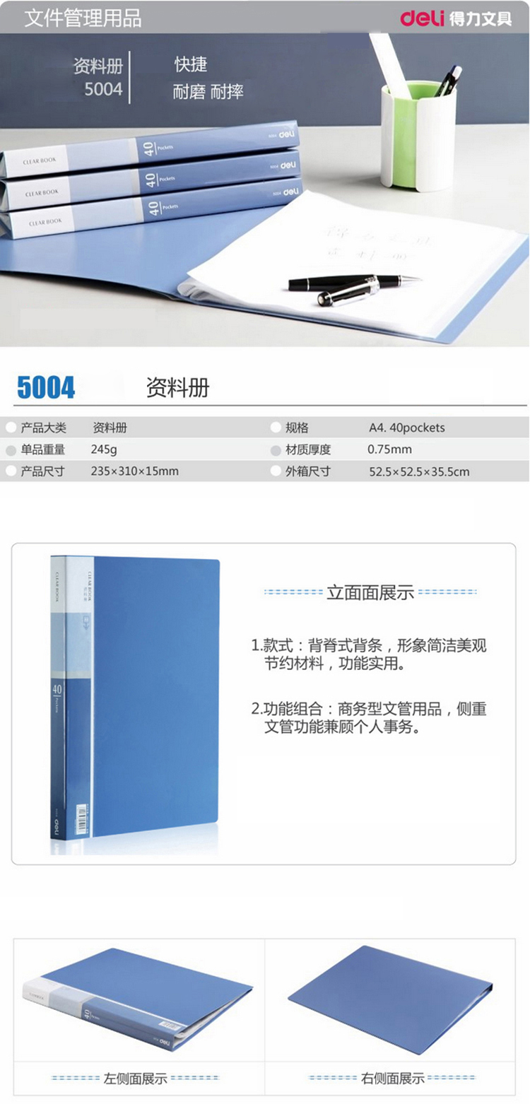 • 型號:得力(deli)5004 無襯紙透明資料冊 40頁 藍(lán)色