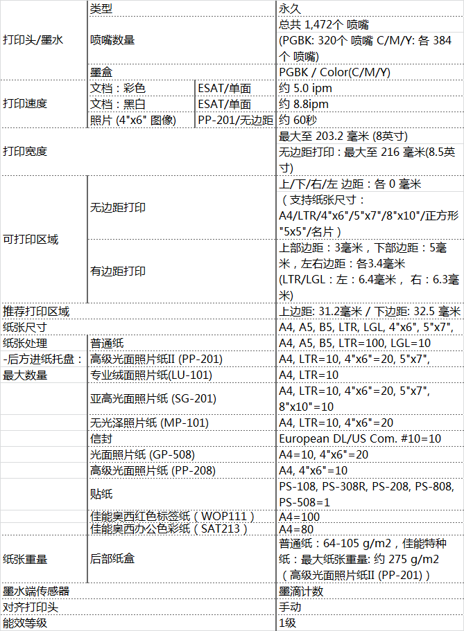 • 打印速度:黑白:約8.8ipm 彩色:約5ipm 其它打印速度:4"×6"照片(PP-201/無邊距):約60秒