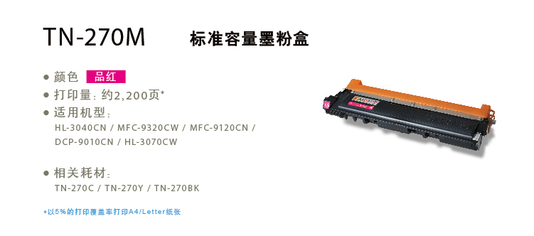 兄弟(brother) TN-270M 品紅色 粉倉(適用于DCP-9010CN/HL-3040CN/HL-3070CW/MFC-9120CN/MFC-9320CW)(kj)
