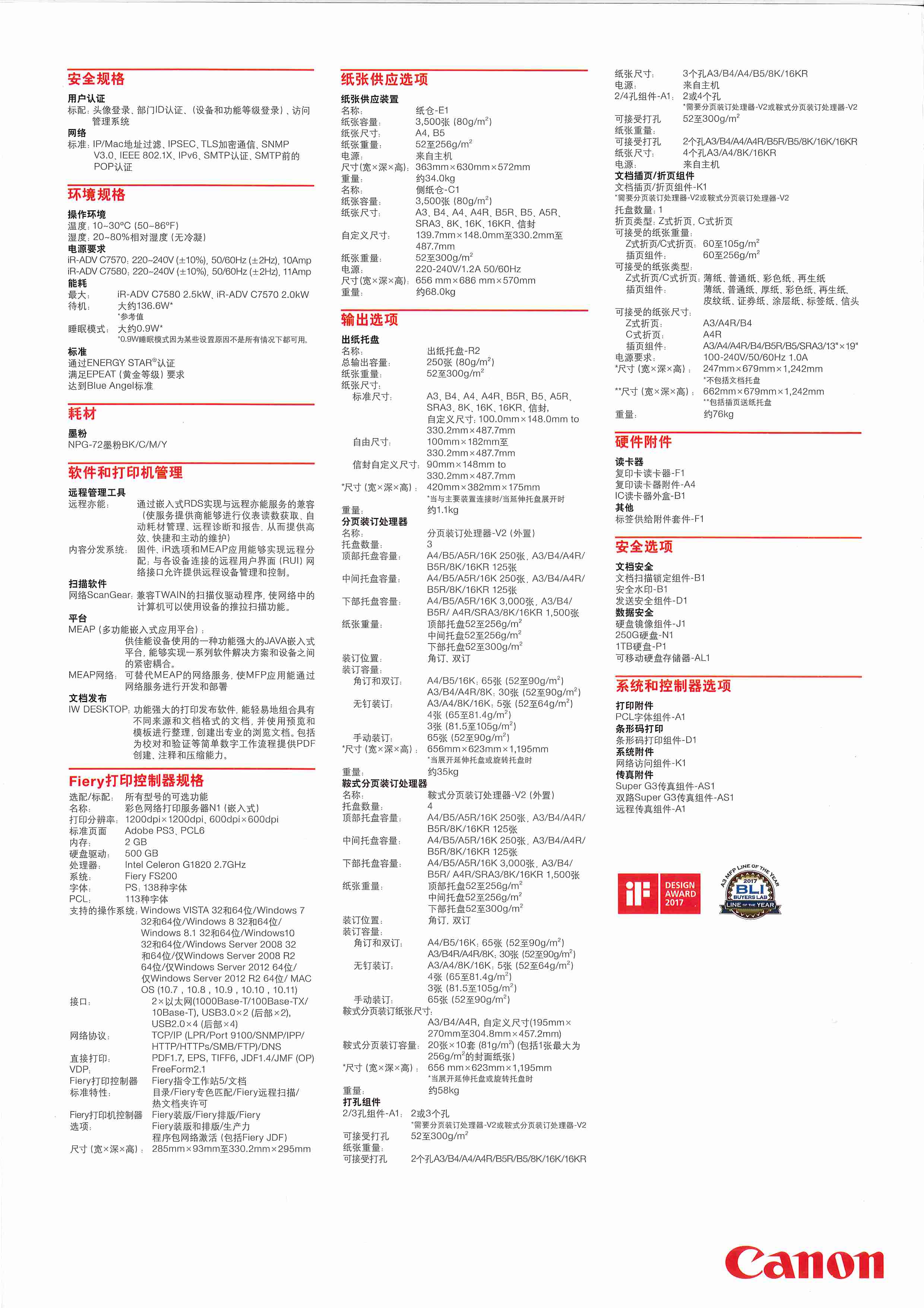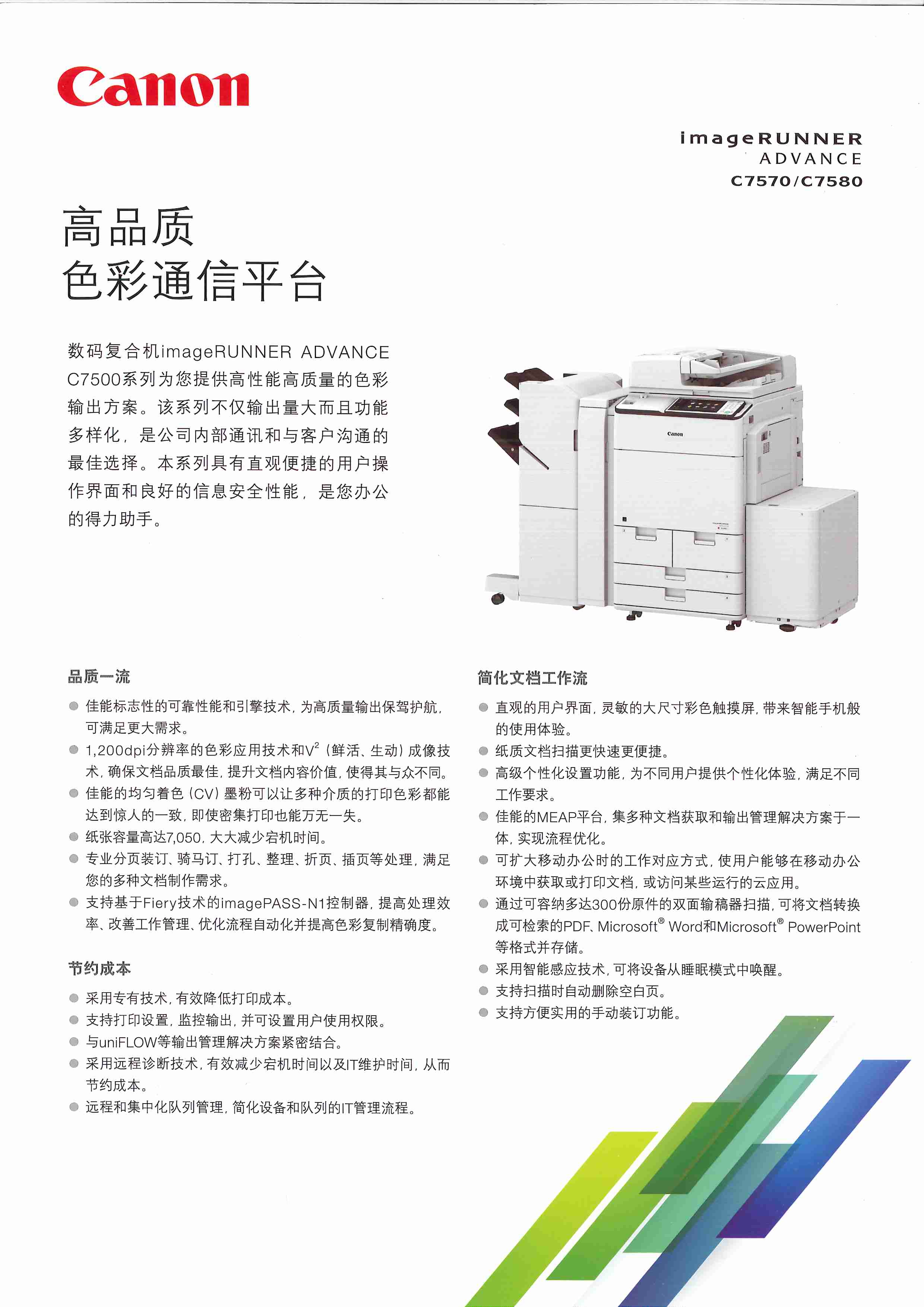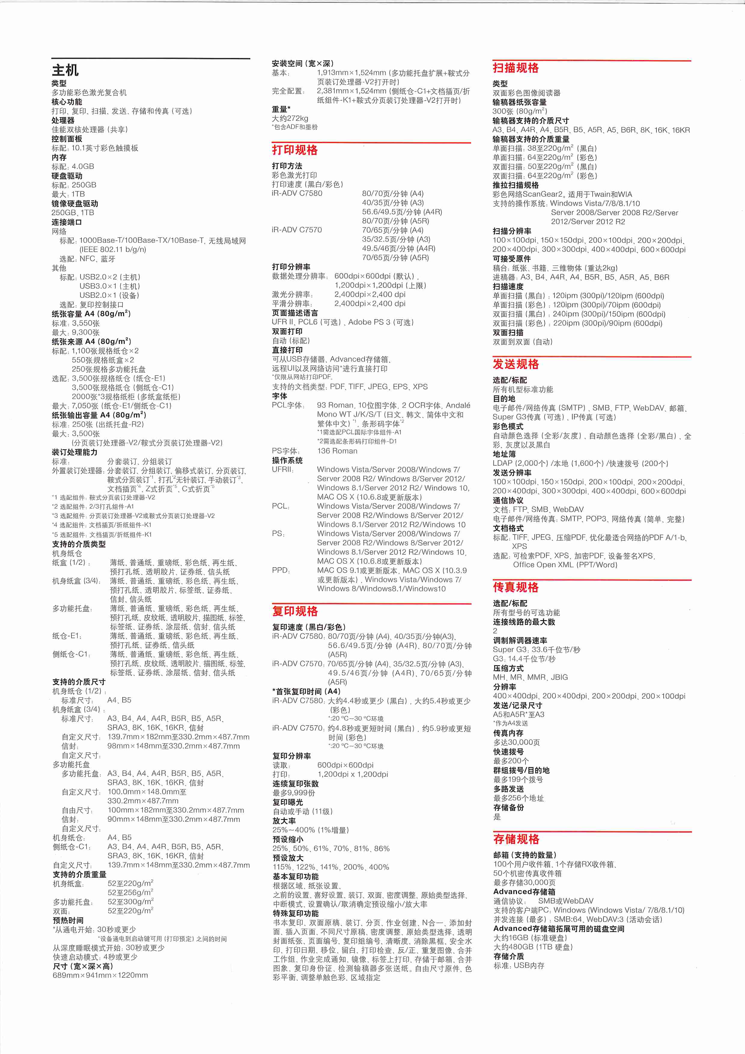 佳能 IR-ADV C7580復合機(含鞍式騎馬裝訂器/緩沖區(qū)組件/6年全包服務(wù))【基本費用前5年按56148元/半年收取、第6年按21000元/半年收?。ò肽臧『诎?0萬張、彩色1.8萬張)。合計12期收費?;举M用每半年預收,半年后收取超出的費用及下半年的基本費用】(超出部分的費用是不確定值,每張按黑白0.04元、彩色0.50元收取,客戶另行結(jié)算,沒計入本合同總價內(nèi)。)