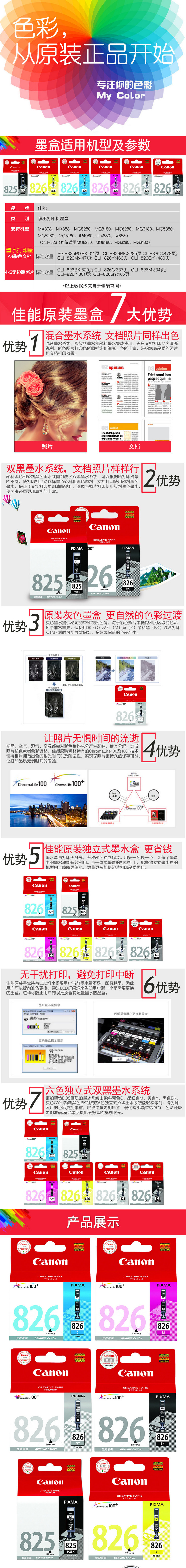 • 商品名稱:佳能(Canon)CLI-826 五色墨盒(CLI-826 BK/C/M/Y/PGI-825 BK) 適用于機(jī)型:IX6580 五只裝