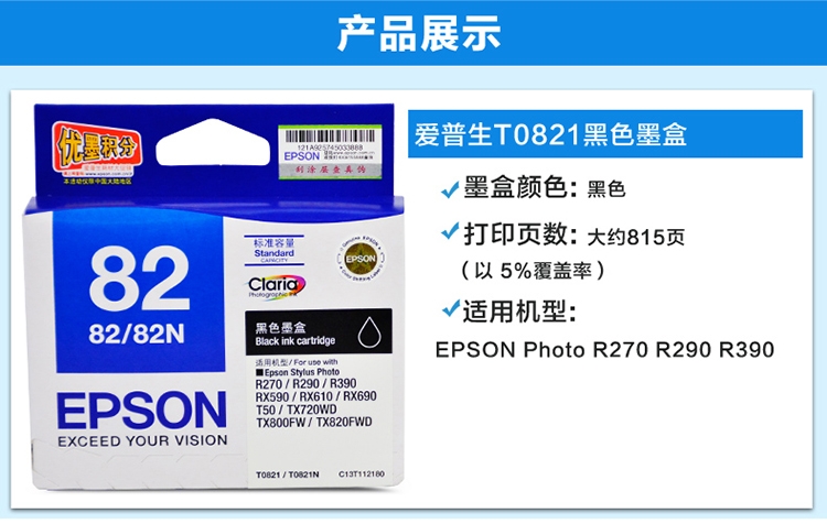 - 商品名稱:愛普生(Epson)T0821 黑色墨盒 (適用于EPSON r290 R390 tx820fw R270 82N T0821)打印量約815頁(yè)(kj)