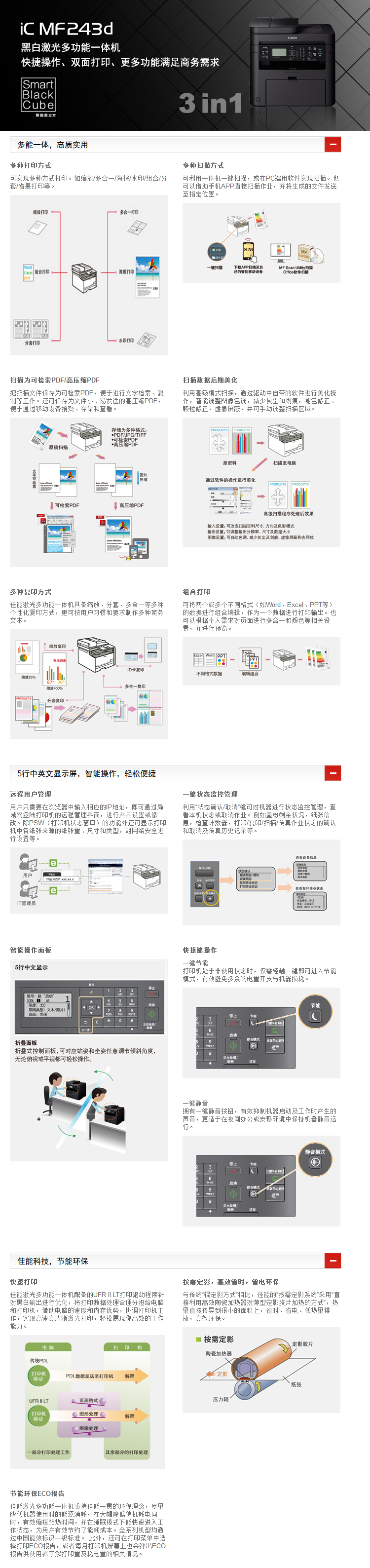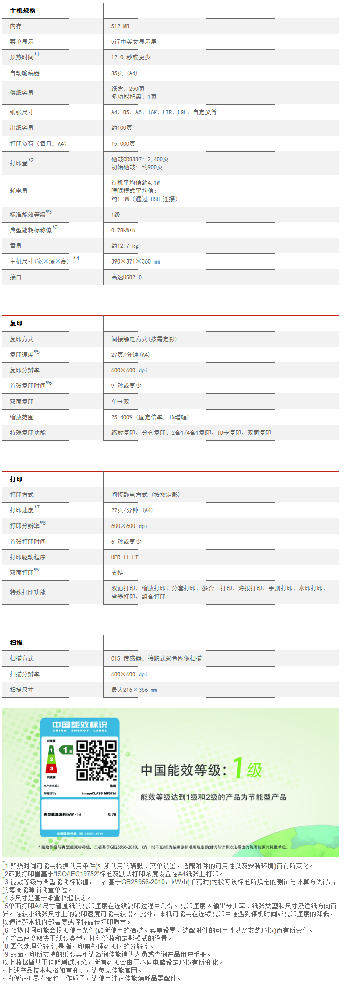 - 商品名稱:佳能(Canon)imageCLASS MF243d A4幅面黑白激光多功能一體機 打印復印掃描 適用耗材:CRG337 27頁/分鐘 600×600 dpi