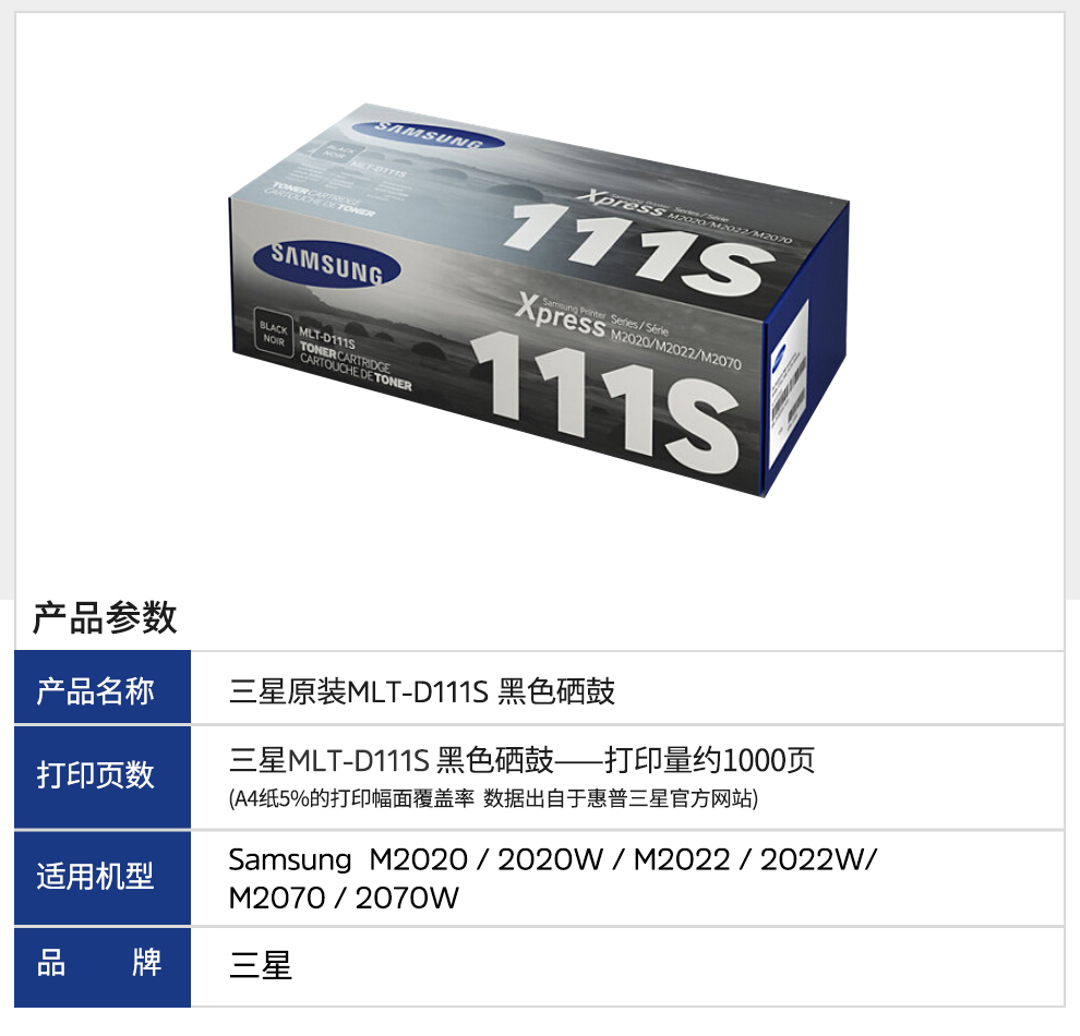 - 商品名稱:三星(SAMSUNG ) 原裝 MLT-D111S(標準容量) 硒鼓 適用于 M2020/M2020W/M2021/M2021W/M2022/M2022W/M2070/M2070W/M2070F/M2070FW/M2071/M2071W/M2071FH 打印量1000頁 (kj)