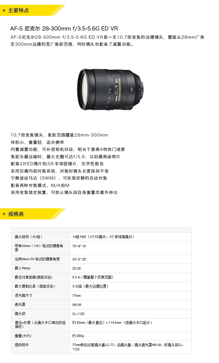 • 商品名稱(chēng):尼康(Nikon) AF-S 尼克爾 28-300mm f/3.5-5.6G ED VR FX 變焦鏡頭