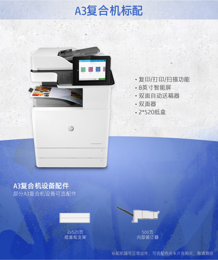 惠普(HP)Color LaserJet Managed MFP E77422dn管理型彩色數(shù)碼復(fù)合機(jī)(復(fù)印/打印/掃描)A3 有線網(wǎng)絡(luò) 自動(dòng)雙面 黑彩同速22頁(yè)/分鐘 1200×1200dpi 適用耗材:四色硒鼓W9100MC/W9101MC/W9102MC/W9103MC(主機(jī)+雙紙盒+雙面輸稿器)