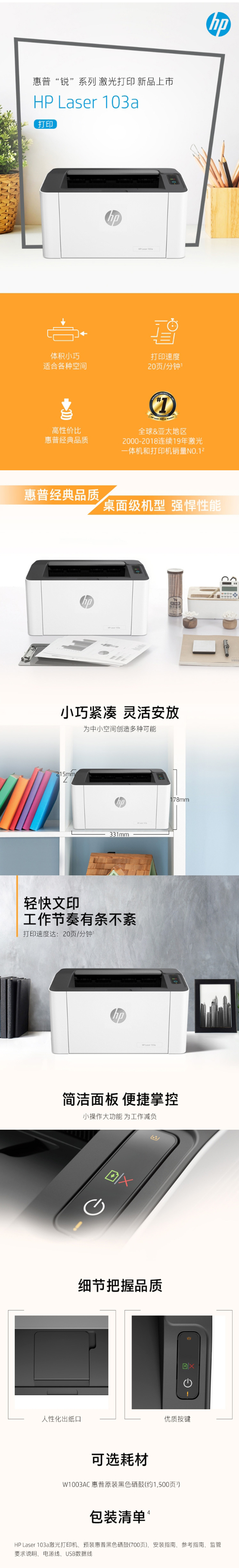 - 商品名稱:惠普(HP)A4黑白激光打印機(jī)Laser 103a 20ppm 手動(dòng)雙面 不支持網(wǎng)絡(luò)功能 分辨率1200*1200dpi 適用耗材:W1003AC 一年送修