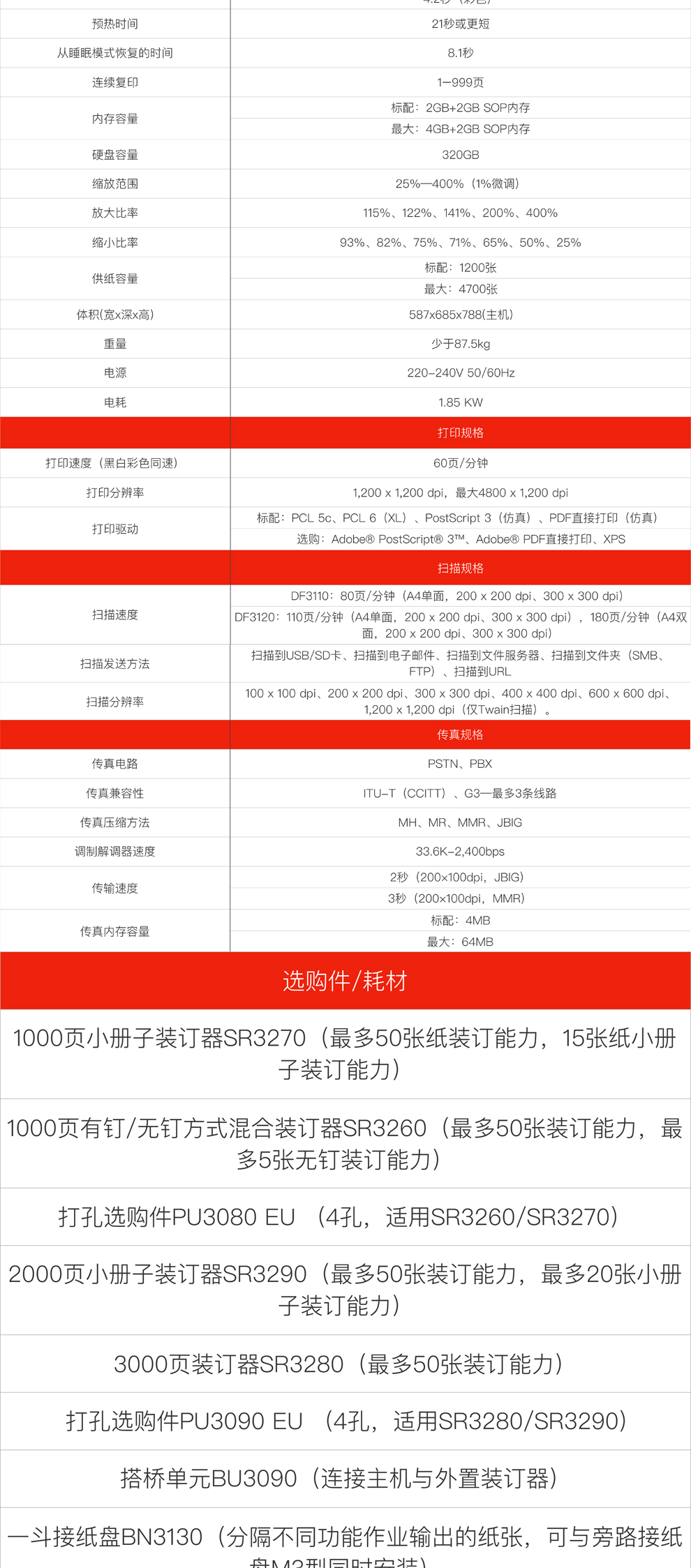 掃描速度:DF3110:80頁(yè)/分鐘(A4單面,200 x 200 dpi、300 x 300 dpi), DF3120:110頁(yè)/分鐘(A4單面,200 x 200 dpi、300 x 300 dpi),180頁(yè)/分鐘(A4雙面,200 x 200 dpi、300 x 300 dpi)