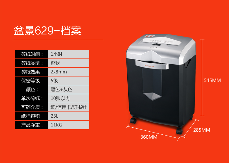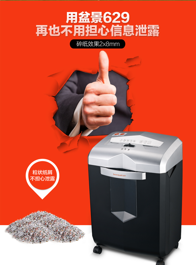 • 商品名稱:盆景(bonsaii)629 碎紙機(jī) /粒狀(2x8mm)/ 單次可碎10張/ 連續(xù)碎紙1小時(shí)/ 五級保密 23L容量