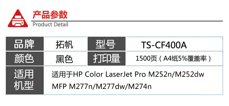 • 商品名稱:拓帆TS-CF400A打印機硒鼓適用于HP MFP M277