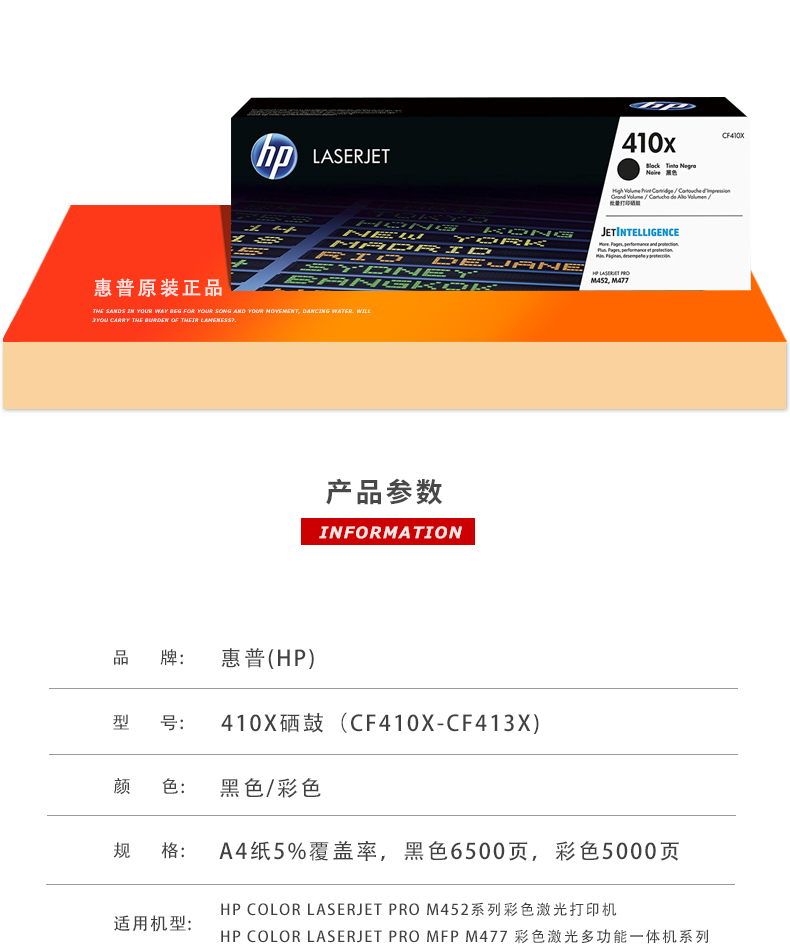 • 商品名稱(chēng):惠普(HP) 410X 黑色大容量硒鼓CF410X 適用于HP Color Laser Jet Pro M452 系列 HP Color Laser Jet Pro M477 系列 HP Color Laser Jet Pro M377 系列 約6500頁(yè)