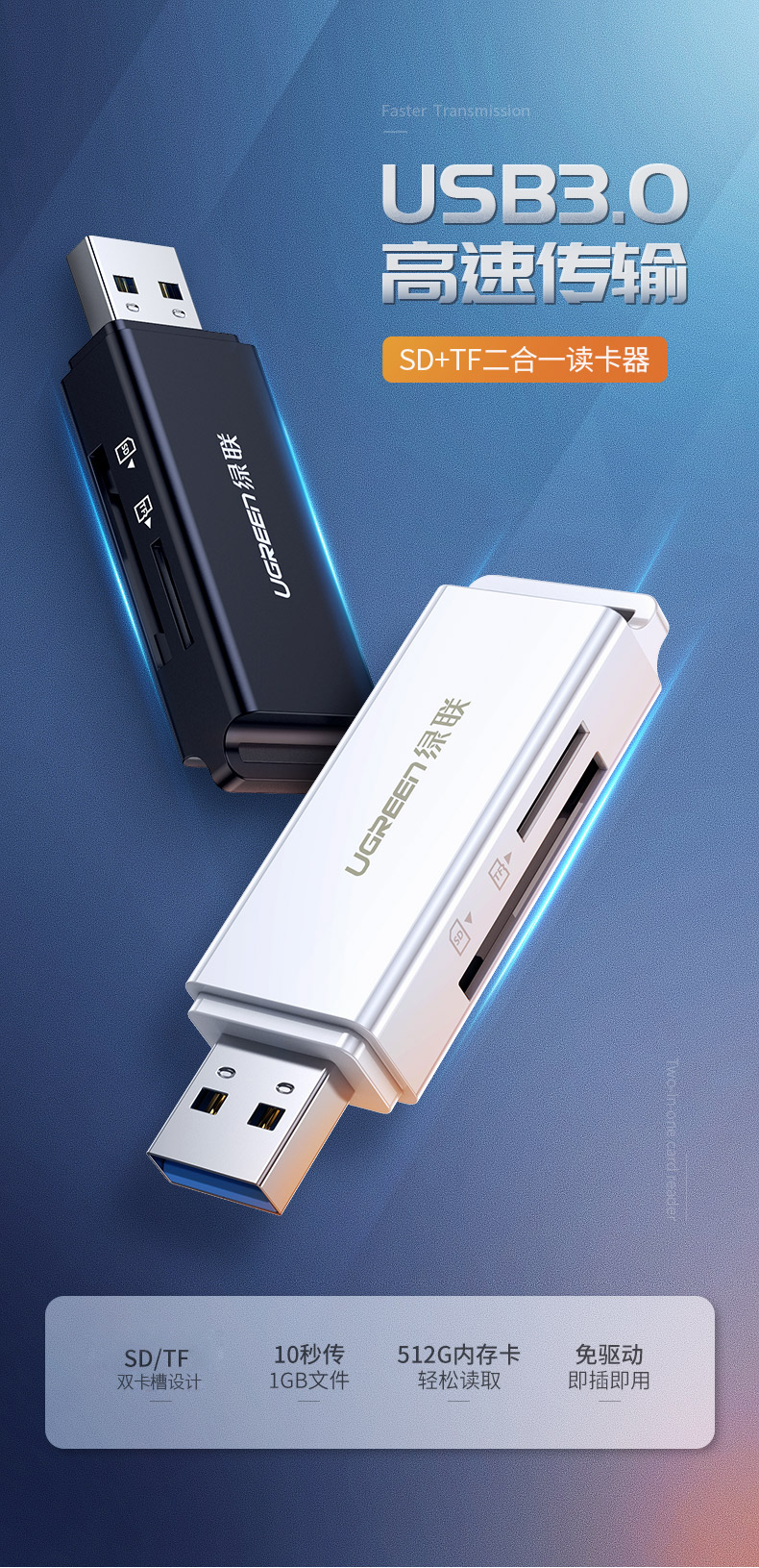 • 商品名稱:綠聯(lián)(UGREEN)多功能讀卡器 USB3.0 白色40751