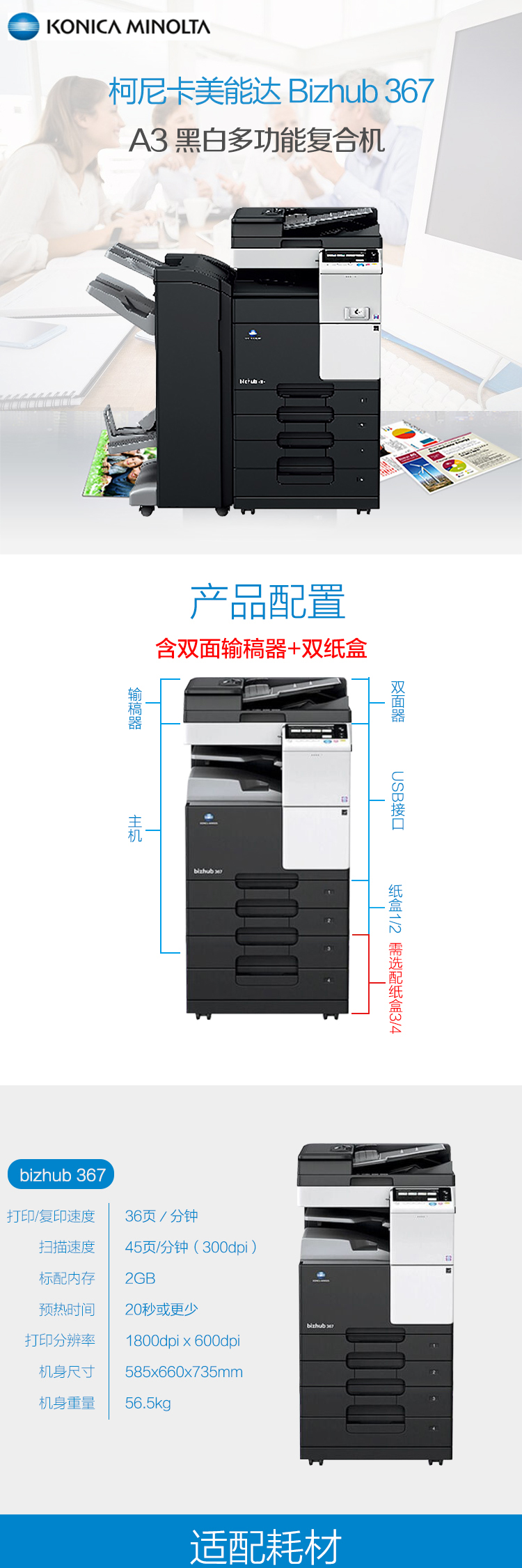 柯尼卡美能達(dá)(KONICA MINOLTA) 黑白多功能復(fù)合機(jī) bizhub 367 A3幅面36ppm 雙紙盒 自動(dòng)雙面輸稿器 打印 復(fù)印 掃描 有線網(wǎng)絡(luò) 一年保修 黑色