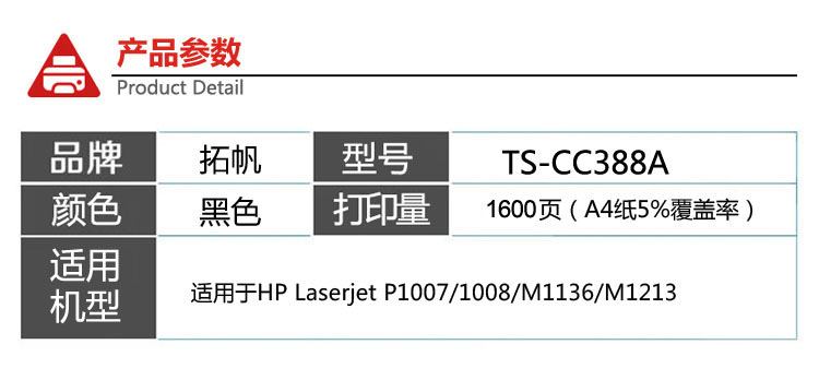 - 商品名稱:拓帆 TS-CC388A 黑色打印機(jī)硒鼓 1600頁 適用于惠普HP P1007/1008/M1136/M1213