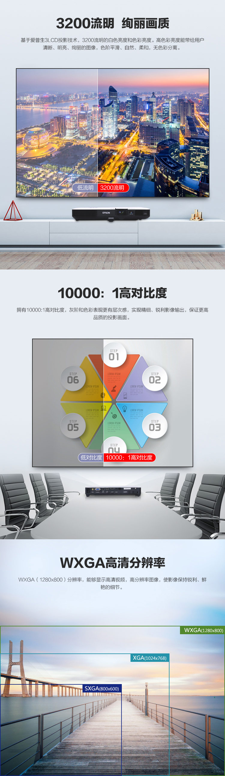 愛普生(EPSON) CB-1785W 投影機(jī) 便攜式投影儀 3200流明 3LCD顯示技術(shù) WXGA(1280*800)分辨率 對(duì)比度 10000:1