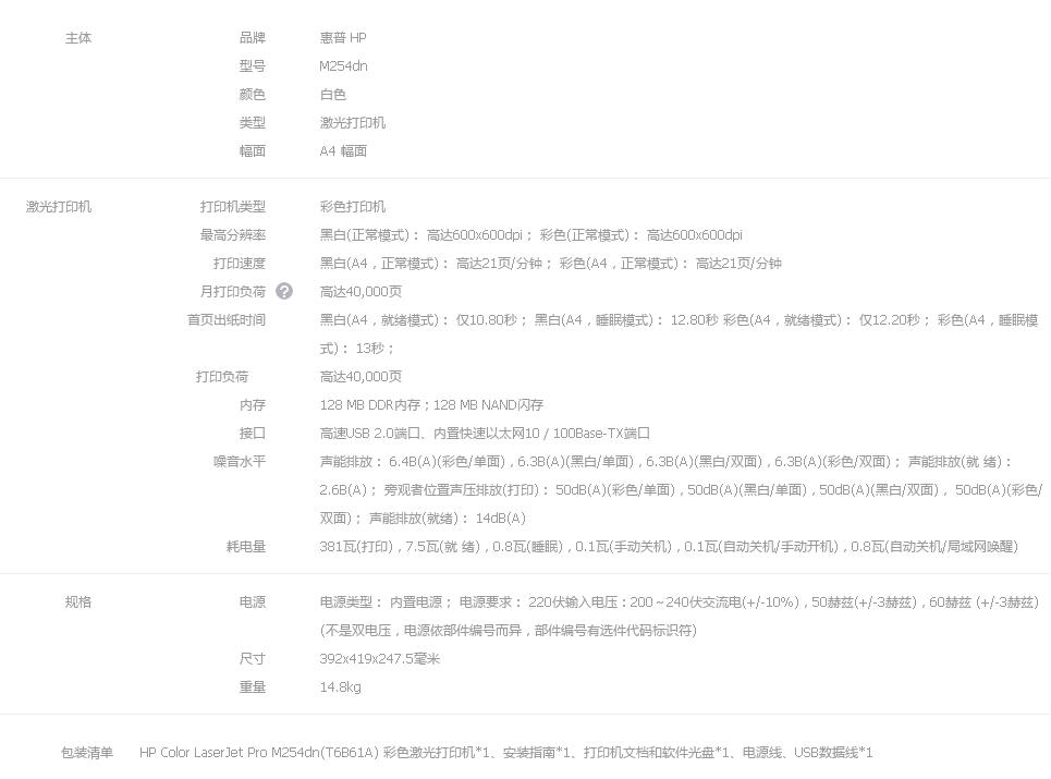 • 商品名稱:HP彩色激光打印機(jī)Color LaserJet Pro M254dn