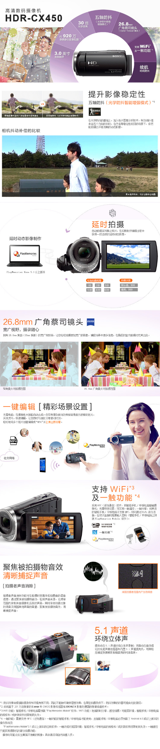 索尼(SONY)HDR-CX450 高清數(shù)碼攝像機(jī) 光學(xué)防抖 30倍光學(xué)變焦 蔡司鏡頭 支持WIFI/NFC傳輸