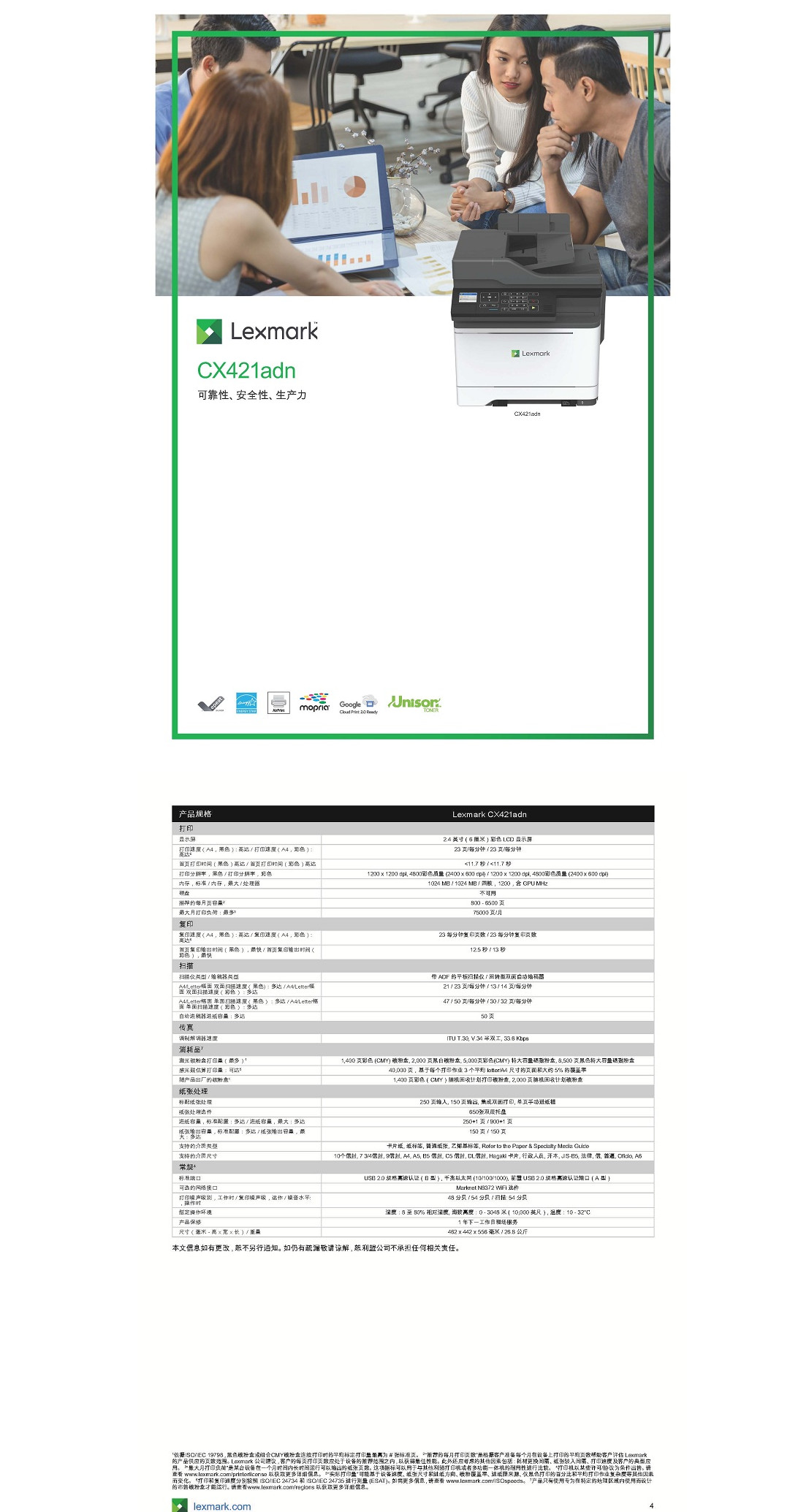 • 商品名稱:利盟(Lexmark)CX421adn(A4幅面)彩色多功能激光一體機 替代CX410DE