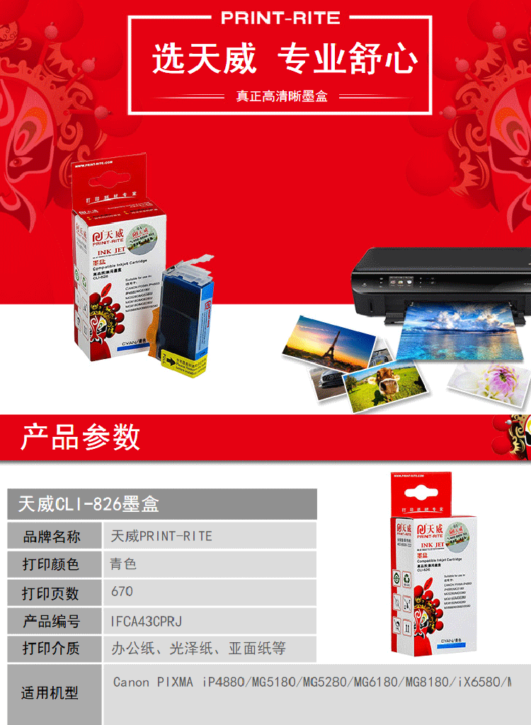 - 商品名稱(chēng):天威(PrintRite)CLI-826 青色墨盒 適用于佳能MX898 iP4880 iP4980 MG5180 MG5280 MG5380 MG6180 MG6280 MG8180 MG8280 MX888 iX6580 打印量670 頁(yè)