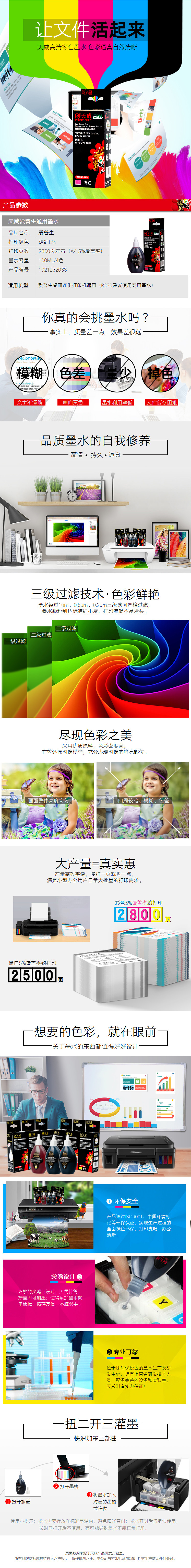 • 商品名稱:天威(PrintRite)適用愛普生EPSON 打印機(jī)墨水 連供 墨盒 100ml填充墨水 淺紅