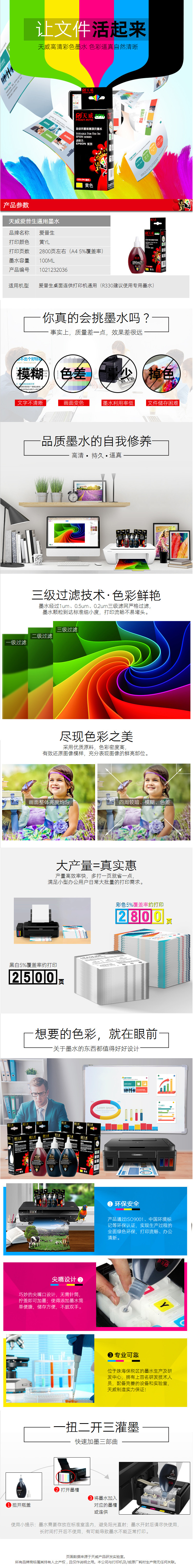 • 商品名稱:天威(PrintRite)適用愛普生EPSON 打印機(jī)墨水 連供 墨盒 100ml填充墨水 黃色