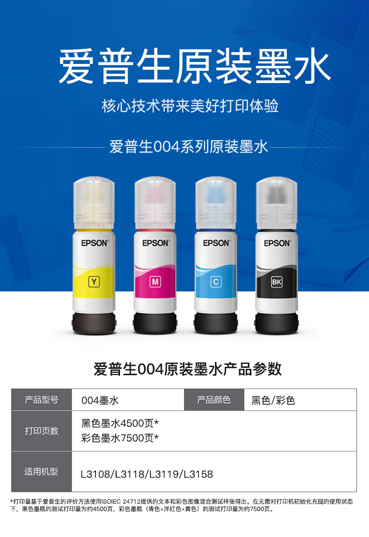 愛普生(Epson)L3118 四色墨水套裝(黑青紅黃) 黑色4500頁(yè)/彩色7500頁(yè)打印量 適用機(jī)型:L3108/L3118/L3119/L3158