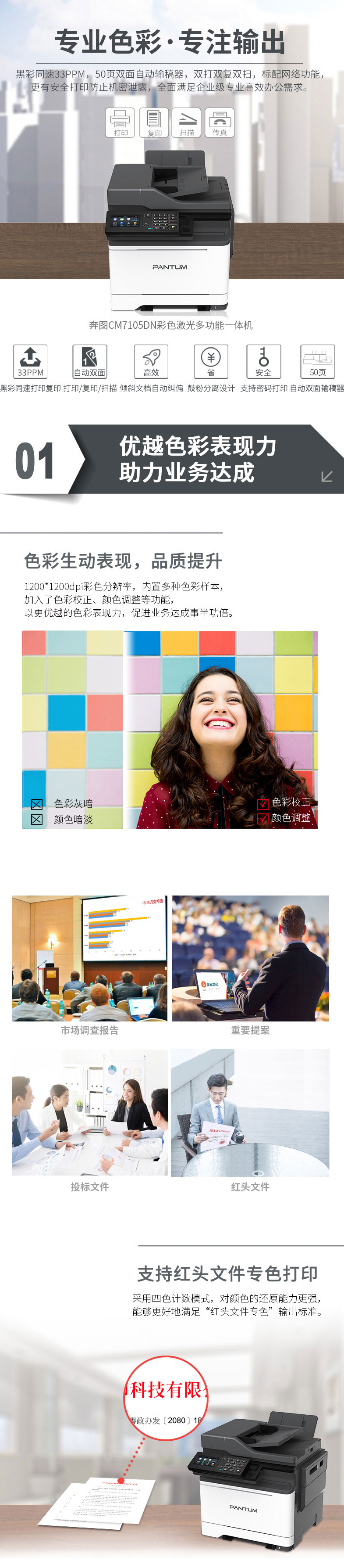 奔圖(Pantum)CM7105DN 彩色多功能一體機(jī) A4幅面 自動(dòng)雙面打印復(fù)印掃描 單面?zhèn)髡?33PPM 1200*1200dpi 帶輸稿器 標(biāo)配網(wǎng)絡(luò)功能 支持密碼打印 白色
