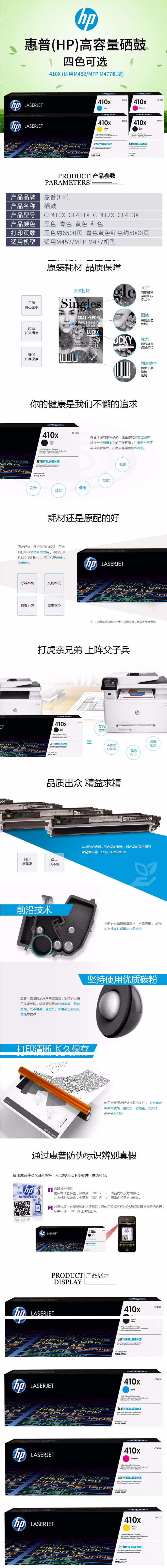 • 商品名稱:惠普(HP)CF411X 410X大容量青色硒鼓 適用M452dw/nwM477fdw/fnM377dw 打印量5000頁