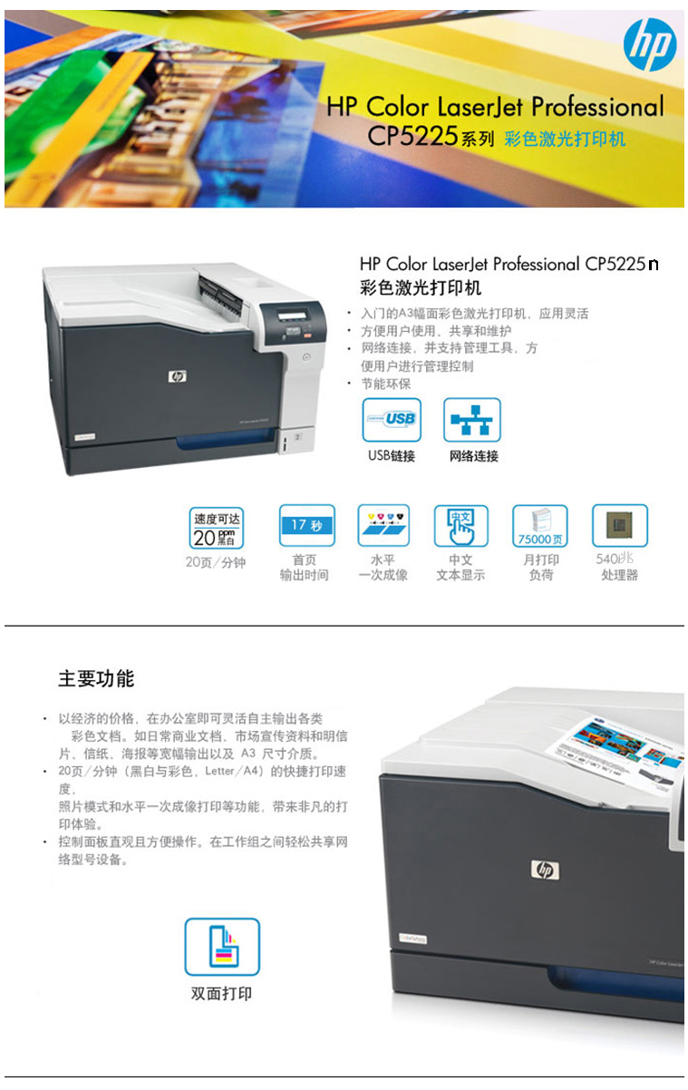 - 商品名稱:惠普(HP)Color LaserJet Pro CP5225n A3彩色激光打印機 A3幅面 兩年送修