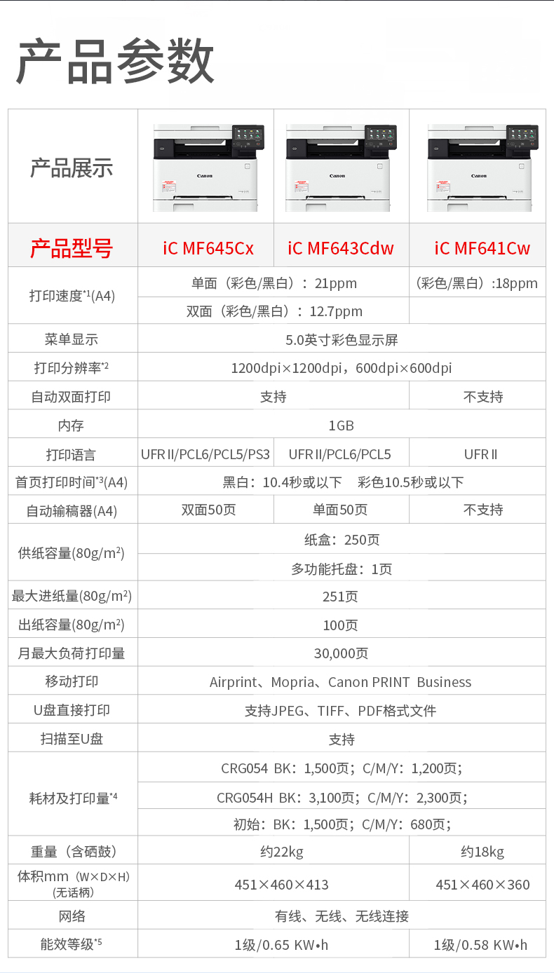 - 商品名稱:佳能(Canon)A4彩色激光多功能一體機(jī)imageCLASS MF643Cdw 打印/復(fù)印/掃描 有線/無線網(wǎng)絡(luò)打印 21頁/分鐘 自動雙面打印 適用耗材:CRG054系列 一年保修